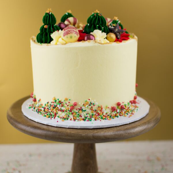 Dit jaar maken we weer een heerlijke, hoge taart voor je! Je kiest zelf of je Vanille of Red Velvet cake wilt en wij werken de cake af met onze heerlijke, zachte botercrème! Bovenop decoreren we de taart royaal met Kerstbomen van botercrème (inclusief piek, uiteraard) en diverse Kerstchocolade.
